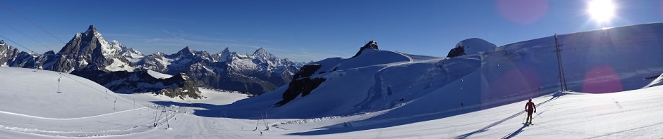 And those early mornings are breathtaking. Stepping out onto the Matterhorn Glacier with the soaring peak of the Matterhorn (4,505 m.) jutting sharply into the sky to your right. In the distance, the Mont Blanc massif (4,808 m.) rises out of the haze. The Breithorn (4,164 m.) looms over your left shoulder and even at 7:00am there are climbers trudging to the peak up a well-worn trail. The vast snowfield surrounds you.